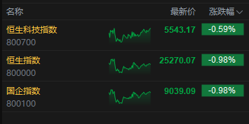 8月15日消息,港股三大指数集体下跌。截至收盘,恒生指数跌0.98%,报25270.07点,恒生科技指数跌0.59%,国企指数跌0.98%。盘面上,科网股普跌,阿里巴巴、网易、京东跌超3%,美团跌超2%,哔哩哔哩涨超2%;互联网医疗股大涨,叮当健康涨超36%;中资券商股走强,中信建投涨超10%;生物技术股多股大涨,银诺医药上市首日涨超206%;苹果概念午后持续走强,鸿腾精密涨超33%;半导体板块涨幅居前,英诺赛科涨超17%;稳定币概念走弱,耀才证券金融跌超7%。