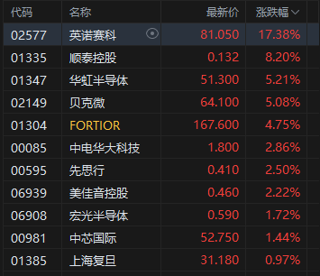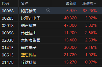 苹果概念午后持续走强,鸿腾精密涨超33%。鸿腾精密日前发布中期业绩,上半年取得营收23.05亿美元,同比增加11.53%;公司拥有人应占利润3151.1万美元,同比减少3.11%。招银国际发布研报称,在与管理层进行业绩后NDR交流后,该机构看好鸿腾在第二季度业务转型加速,其中两大战略性业务板块包括AI云业务/汽车业务的2Q收入占比已经提升至36%(2024年为24%),并且分别在第二季度同比增长28%/115%。