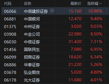中资券商股走强,中信建投涨超10%。7月金融数据显示,非银行业金融机构存款大幅增加2.14万亿元,同比多增1.39万亿元,反映出资金流向的结构性变化,居民资金正通过多种渠道向金融市场转移。华泰证券表示,随着市场风险偏好上行,券商板块净资产收益率进入上行期。且本轮券商业绩或具备更强稳定性、持续性,关注市场+预期+业绩正循环下的券商持续修复行情。