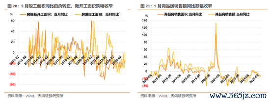 9月竣工面积同比由负转正,新开工面积跌幅收窄。9月竣工面积累计同比、当月同比分别为-15.3%、0.4%,环比变动1.7、21.6个百分点。房屋新开工面积当月同比为-15.0%,前值-19.8%,累计同比为-18.9%,前值-19.5%。
