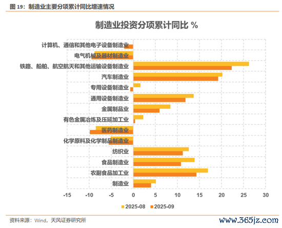 制造业投资分项全部回落。目前公布的制造业主要分项(共13个)9月累计同比增速数据中,全部分项均回落,回落幅度较大的有铁路、船舶、航空航天和其他运输设备制造业、食品制造业、金属制品业、专用设备制造业等,化学原料及化学制品制造业回落幅度较小。