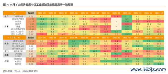 9月3大经济数据中,工业增加值走强且高于WIND一致预期,社消、投资走弱,且低于预期值,工业增加值同比6.5%,预期5.23%,前值5.2%,社消同比3.0%,预期3.11%,前值3.4%,固投同比-0.5%,前值0.5%,预期0.03%。