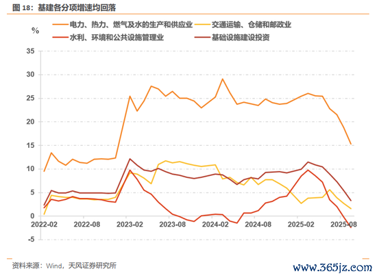 基建各分项增速均回落,基建三大分项累计同比均回落,电力热力燃气及水的生产和供应业、水利环境和公共设施管理业同比增速为15.3%、-2.4%,环比回落3.5、2.2个百分点,交通运输仓储和邮政业累计同比增速为1.6%,环比回落1.1个百分点。