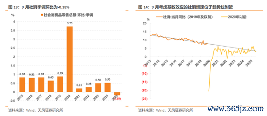 社消9月同比、环比均回落。9月社会消费品零售总额同比增长3.0%,前值3.4%,预期3.11%。9月季调环比报-0.18%,前值0.25%,另外,从分项来看,商品、餐饮消费9月同比分别为3.3%、0.9%,8月同比为3.6%、2.1%。