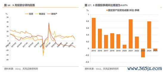 整体投资9月继续回落。9月固定资产投资累计同比增速为-0.5%,8月为0.5%,9月季调后环比为-0.07%,前值-0.15%。