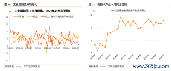 制造业、采矿业回升,电燃水回落。采矿业、制造业、电燃水9月同比为6.4%、7.3%、0.6%,前值5.1%、5.7%、2.4%。1-9月累计同比则为5.8%、6.8%、2.0%。另外,高技术产业增速走阔,9月同比10.3%,前值9.3%。