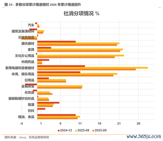 多数分项累计增速相对2024年累计增速回升。限额以上企业商品零售总额9月累计同比为5.1%,8月为5.4%,多数分项累计增速相对2024年累计增速回升。9月增速较高的细分品类主要有家用电器和音像器材、家具、通讯器材,累计同比分别为25.3%、21.3%、20.5%,拖累项为石油及制品,累计同比为-4.9%。